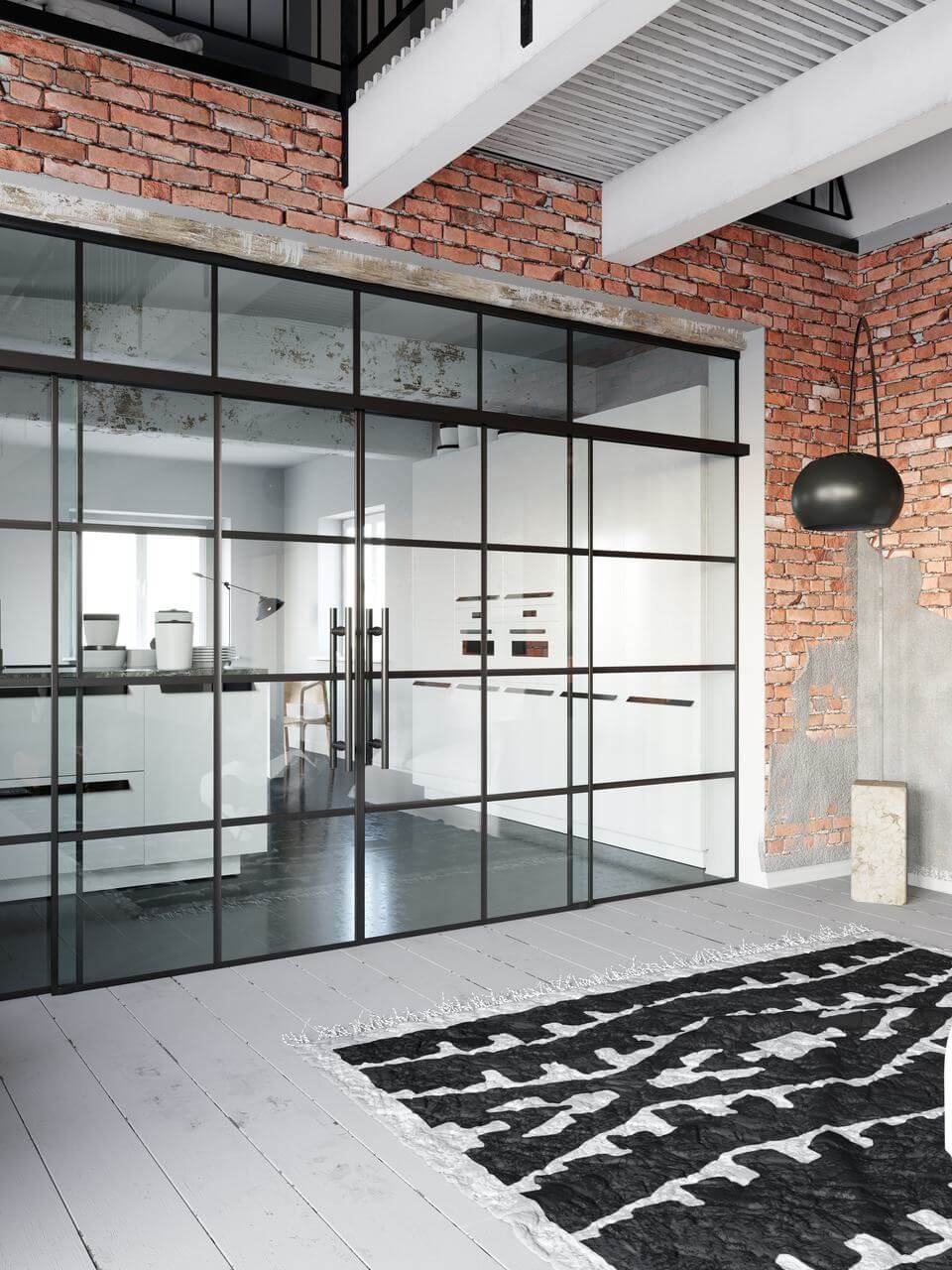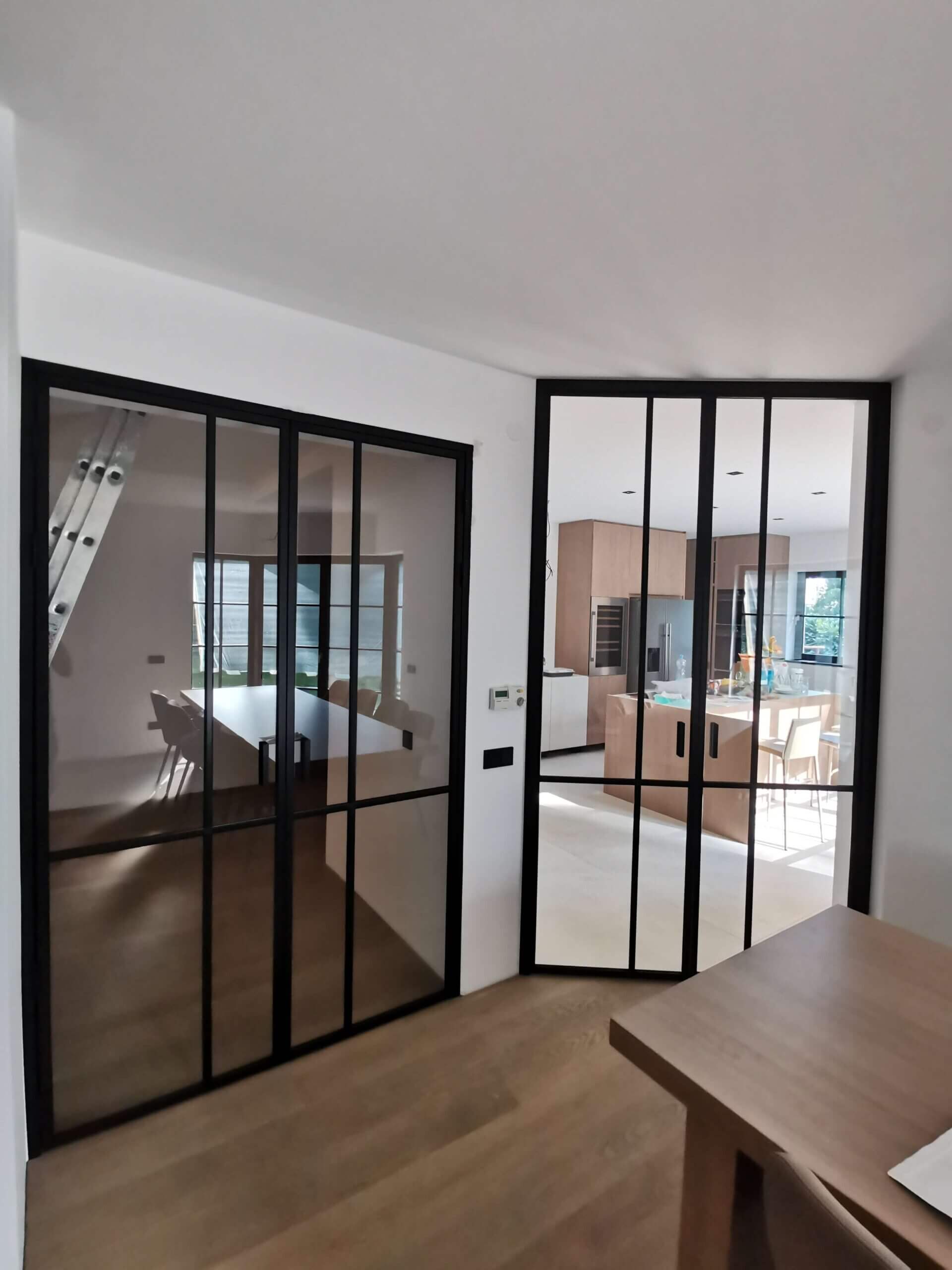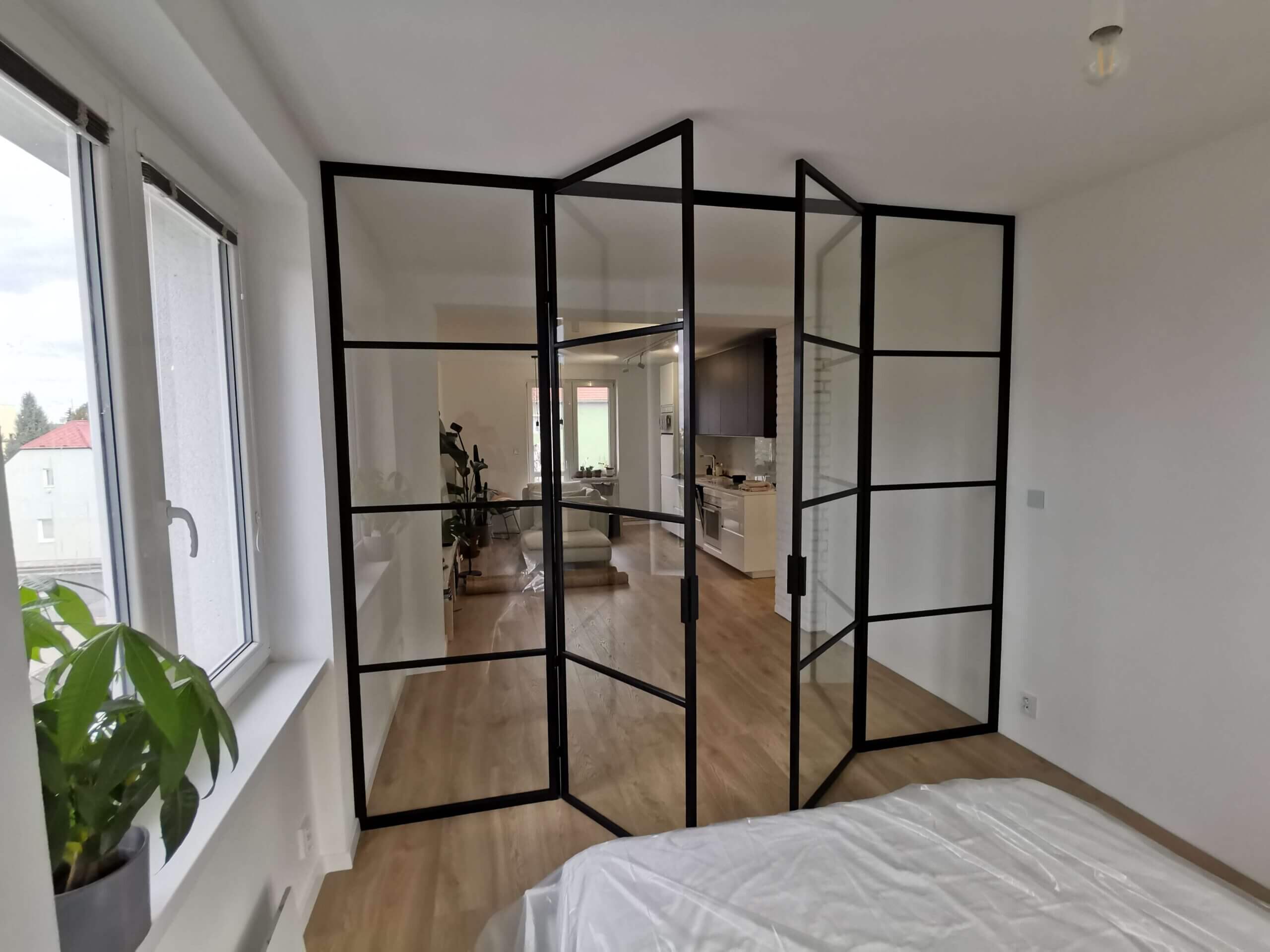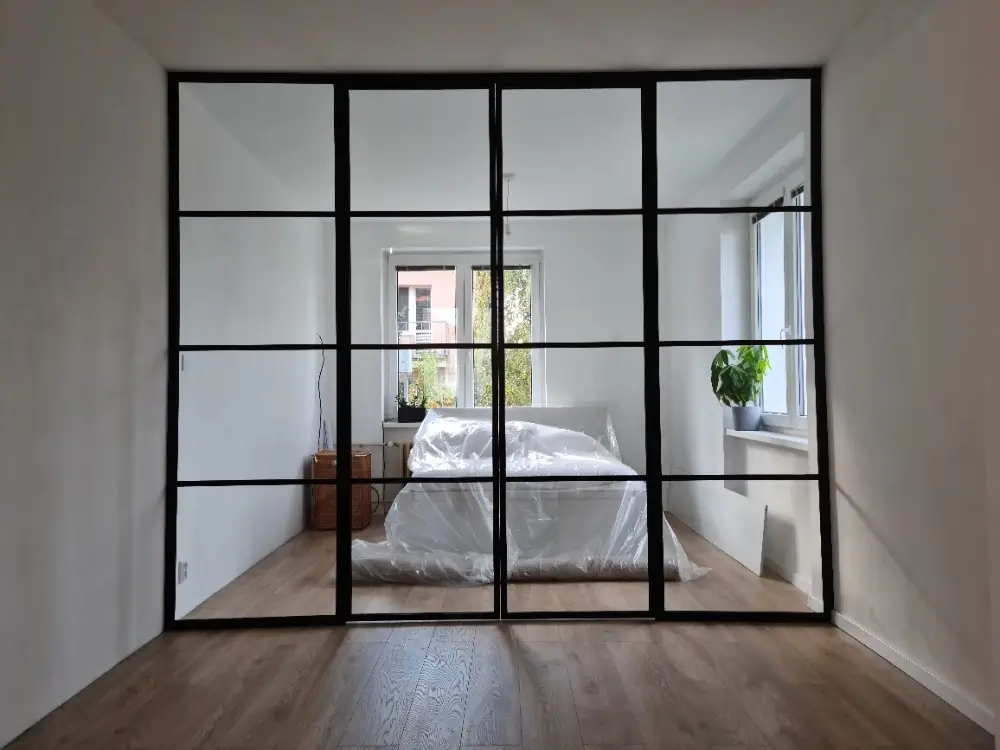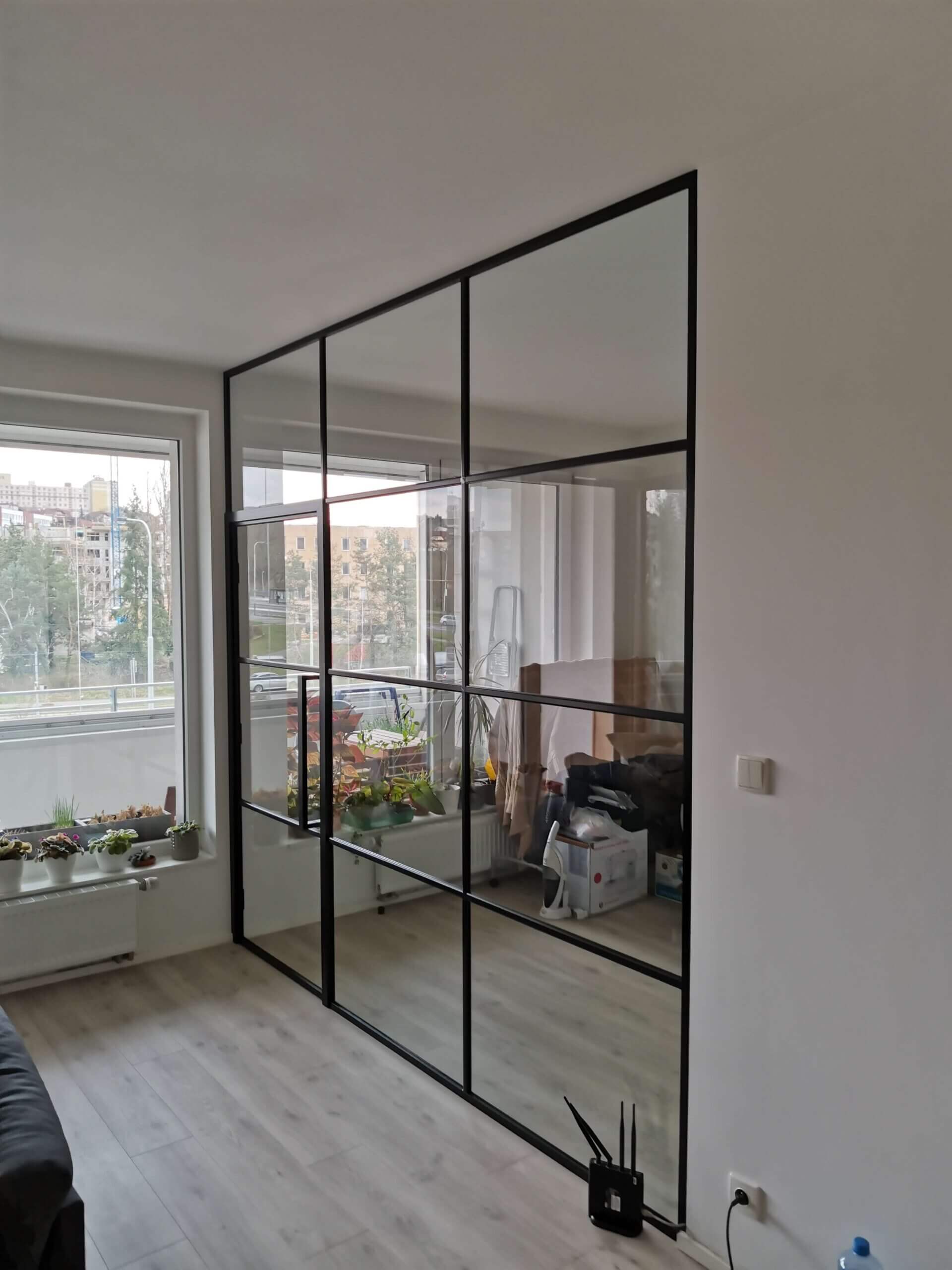 Stěny jsou dostupné s jednokřídlými, dvoukřídlými nebo posuvnými dveřmi, což umožňuje flexibilní řešení pro kanceláře, byty, showroomy i komerční prostory. Kombinace průhledného skla, industriálních prvků a moderního designu vytváří vzdušný, světlý prostor s osobitým charakterem.